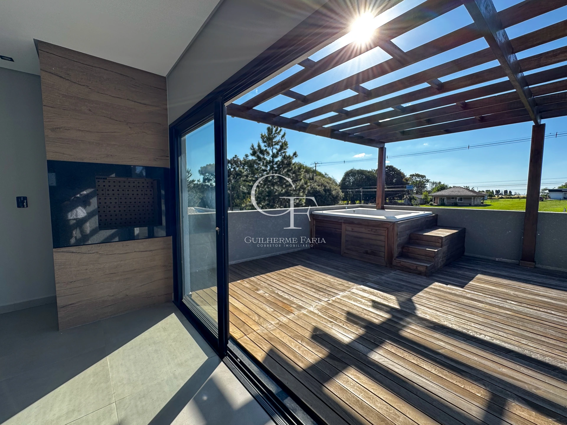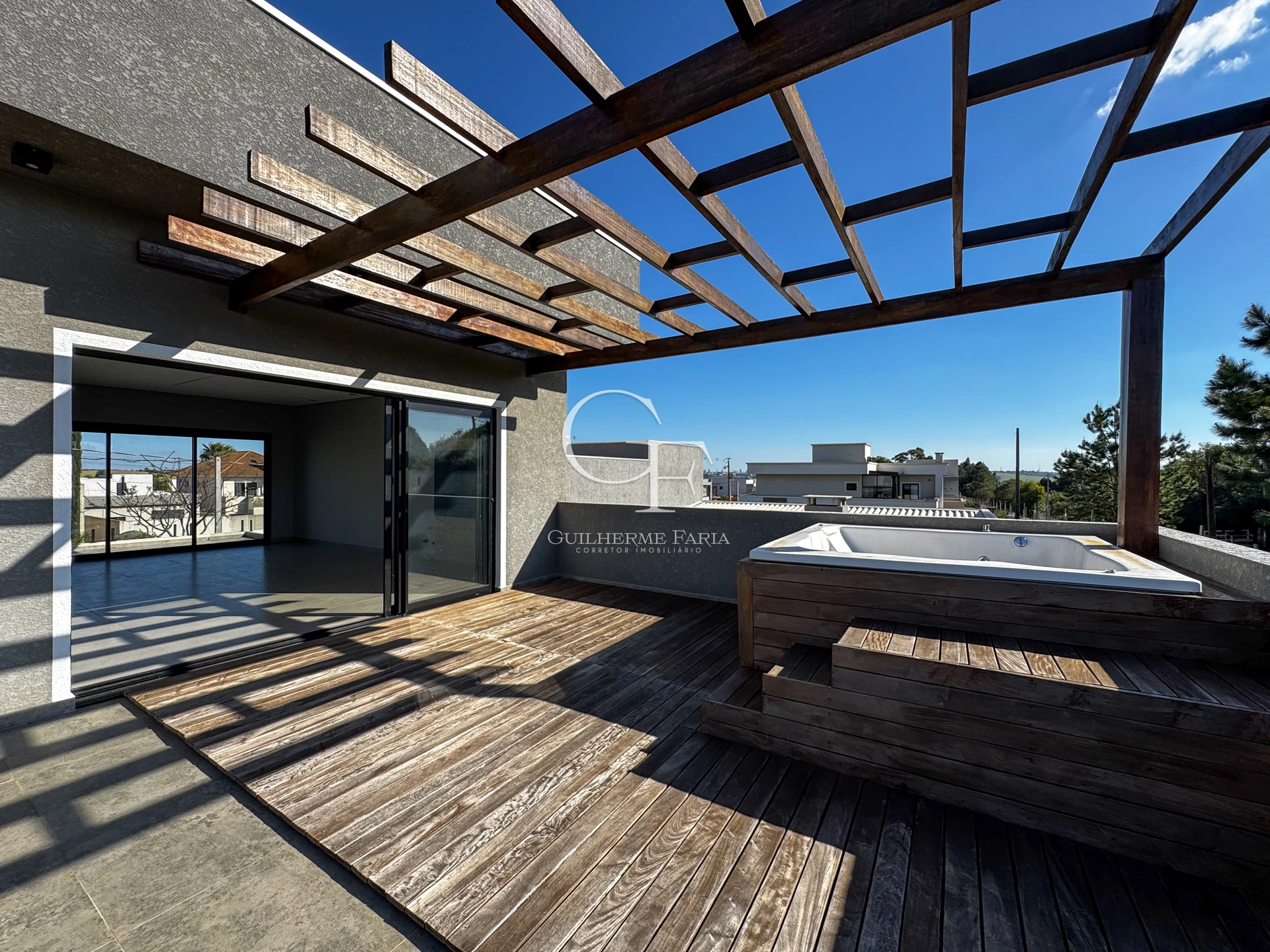 No piso superior, destaque para a área gourmet com churrasqueira, terraço, deck com pergolado e spa.